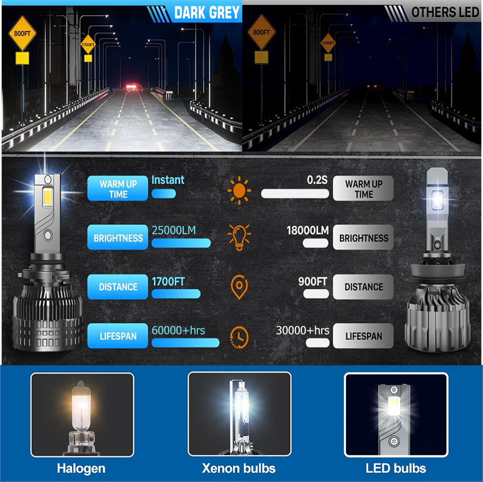 🌟 Illuminate Your Drive: DARKSIDE LED H1, H3, H4/HB2, H7, H11, 9005/HB3, 9006/HB4, 9012/HIR2 LED Headlights. Experience a remarkable 800% increase in brightness with DARKSIDE LED's cutting-edge LED headlights. Crafted with automotive-grade 4575 CSP LED chips, these headlights deliver an impressive 26000 lumens per set. The real watts and lumens (J) specifications highlight an 800% enhancement in brightness compared to standard incandescent headlamps. Emitting a cool 6000K white light, these LEDs replicate the sensation of driving in daylight, enabling drivers to respond to obstacles sooner for a safer night driving experience. ⚡ Revolutionize your driving experience with the convenience of DARKSIDE LED LED bulbs. Boasting an all-in-one wireless design, these bulbs feature a built-in driver and a compact size that minimizes space within the headlight housing. The non-polarity plug ensures a hassle-free installation process that takes just 5 minutes, requiring no additional modifications. It's a true plug-and-play solution for a faster and smoother upgrade... 🚗 Optimal Illumination Position: Elevate Your Visibility with DARKSIDE LED LED Headlights Maintaining a 1:1 illuminate position design, DARKSIDE LED LED headlights replicate the lighting position of stock halogens. This meticulous design guarantees an ideal beam pattern, eliminating dark spots and preventing blinding or glare for oncoming drivers. Make the transition to LED headlights effortlessly and enjoy a hassle-free upgrade.. 🔥 Universal Compatibility: Versatile Performance for a Variety of Vehicles DARKSIDE LED LED headlights feature a direct plug-in structure and are CANbus ready, ensuring compatibility with 99% of vehicles without triggering on-dash errors or flickering issues. These headlights meet the EN55015 standard, offering excellent EMI/RFI protection and eliminating radio interference. While most vehicles seamlessly integrate, some sensitive models may require an additional decode. Weatherproof Design: Ready for Any Condition With an IP68 waterproof rating, a 360° beam angle, and a built-in EMC for CANbus functionality, DARKSIDE LED LED headlights are well-equipped to handle diverse driving conditions. Experience superior visibility and performance without compromise. |