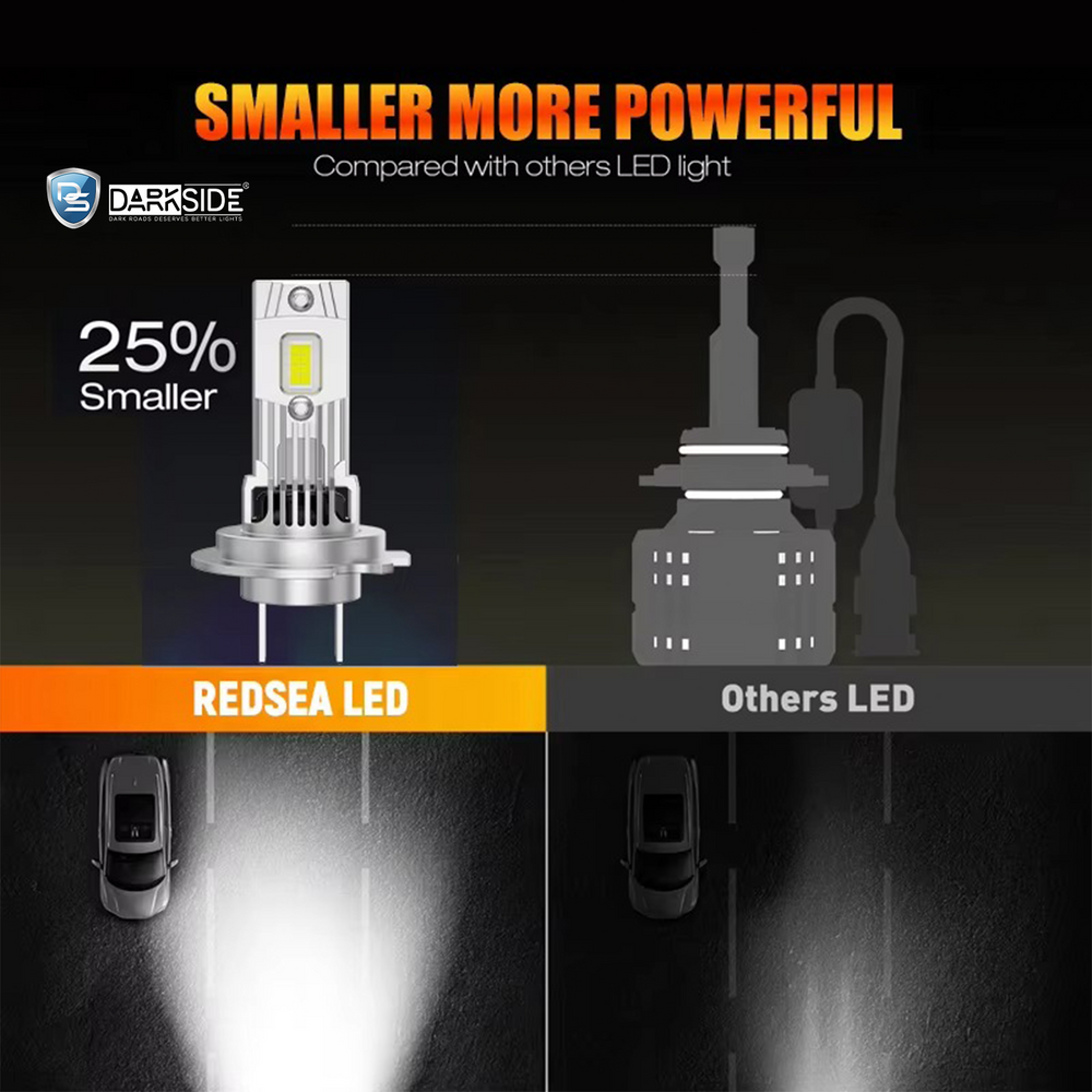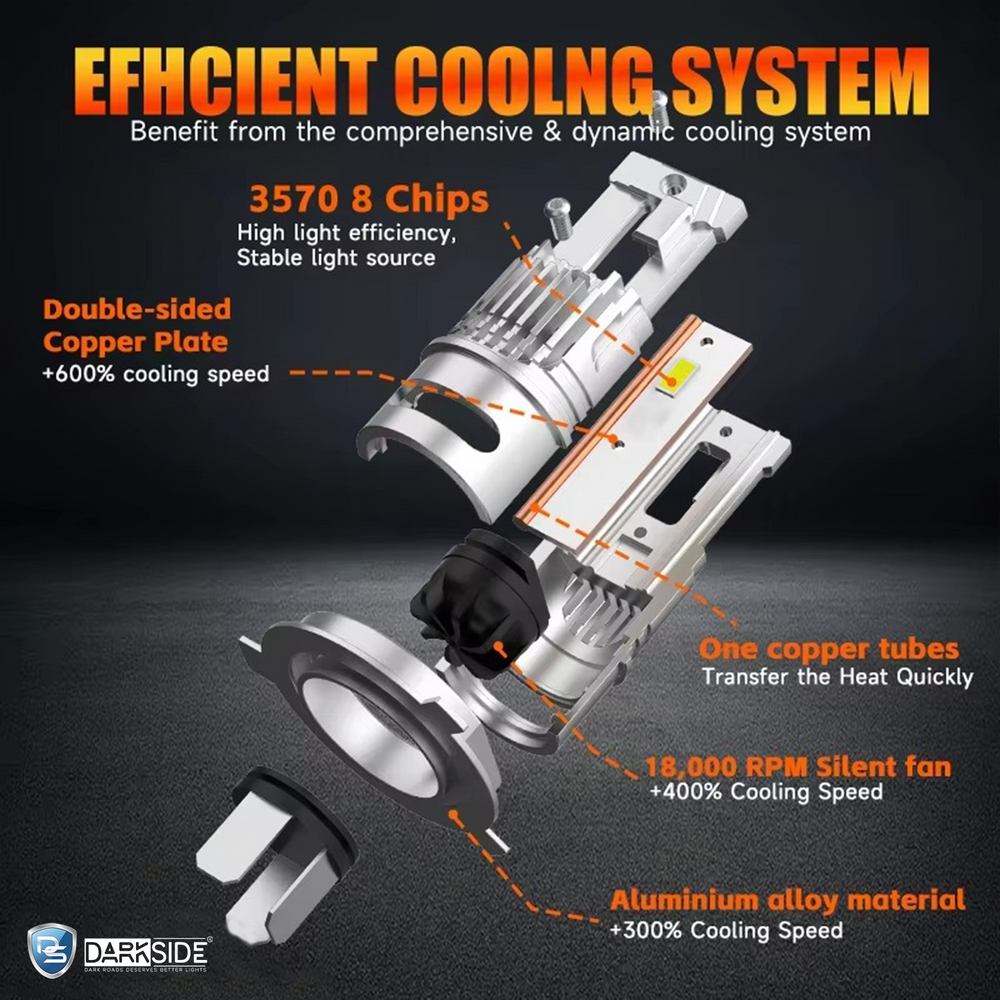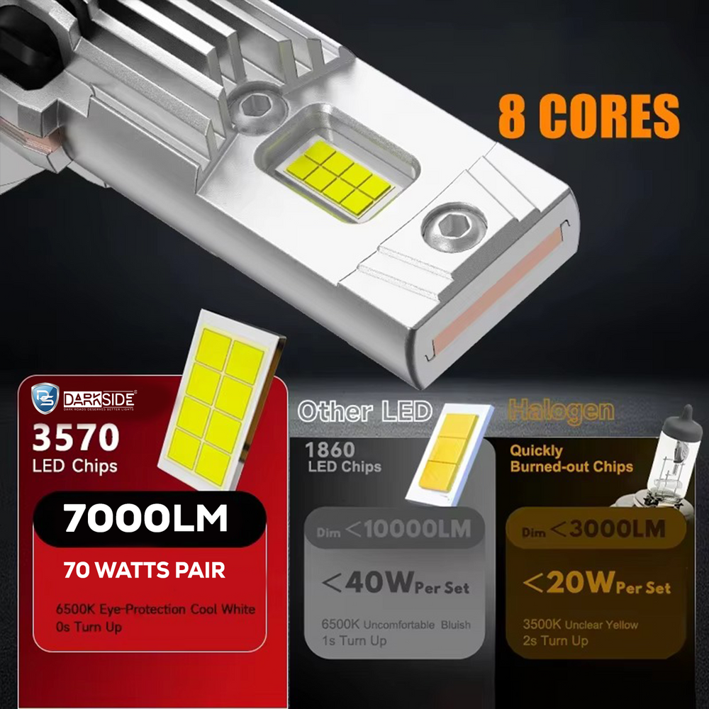 🌟 Explore the Brilliance of (DS-70) LED Headlights by DARKSIDE LED Unparalleled Brightness: DARKSID LED H1, H4/HB2, H7, H11, 9005/HB3, 9006/HB4, 9012/HIR2 LED Headlights Step into a new realm of illumination with the (DS70) LED headlights by DARKSIDE LED, equipped with automotive-grade 4575 12 core Large CSP LED chips that deliver an astounding 17000 lumens per set along with two copper tube. Experience a phenomenal 900% increase in brightness compared to standard incandescent headlamps. Emitting a cool 6500K light yellow, these LEDs not only restore the sensation of driving in daylight but also empower drivers to detect obstacles earlier, ensuring a safer night driving experience.. ⚡ Effortless Installation: Swift Upgrade with DARKSIDE LED H4, H7, H11, 9005 LED Bulbs Upgrade your vehicle seamlessly with DARKSIDE LED bulbs, featuring an all-in-one wireless design. These bulbs, equipped with a built-in driver and a smaller size to occupy less space in the headlight housing, offer a non-polarity plug for a quick 5-minute installation. Enjoy a true plug-and-play solution without the need for extra modifications. 🚗 Optimal Illumination Position: Drive Confidently with DARKSIDE LED Headlights Maintaining a 1:1 illuminate position design, DARKSIDE LED headlights replicate the lighting position of stock halogens. This meticulous design ensures an ideal beam pattern and clearer visibility, eliminating dark spots, blinding, or glare for oncoming drivers. Make the switch to LED headlights hassle-free for an enhanced driving experience. 🔥 Durable Lifespan: Engineered for Longevity Crafted with a complete 6063 aviation aluminum body, a silent turbo cooling fan, and an efficient double-sided thermally conductive copper substrate structure, DARKSIDE LED headlights boast an optimal cooling system. This design extends the lifespan of the headlights up to an impressive 30,000 to 50,000 hours, sparing you from the inconvenience of frequent replacements. Universal Compatibility: Perfect Fit for Your Vehicle DARKSIDE LED headlights feature a direct plug-in structure and are CANbus ready, ensuring compatibility with 99% of vehicles without triggering on-dash errors or flickering issues. Meeting the EN55015 standard, these headlights provide excellent EMI/RFI protection and eliminate radio interference. While seamlessly integrating with most vehicles, some sensitive models may require an additional decode. Weatherproof Design: Ready for Any Challenge With an IP68 waterproof rating, a 360° beam angle, and built-in EMC for CANbus functionality, DARKSIDE LED headlights are equipped to handle diverse driving conditions. Revel in superior visibility and performance without compromise." |